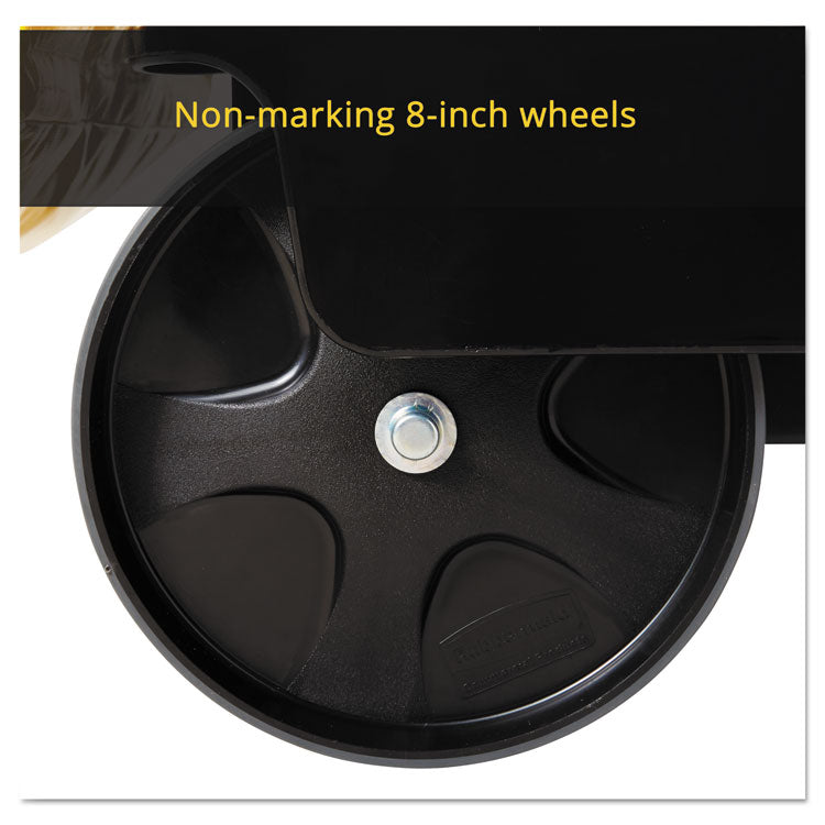 The Rubbermaid Commercial Utility Cart with Zippered Yellow Bag collects waste and transports tools efficiently on 8" non-marking wheels and 4" casters. This versatile utility cart has 3 lipped shelves, and a zippered yellow vinyl bag for collecting refuse or launderable items. The surface of the top shelf features tool grips for keeping frequently used items at hand wherever this service cart travels. Material(s): Structural Foam; Overall Material Type: Plastic; Color(s): Black; Color Family: Black.