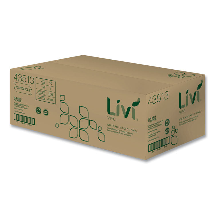 Elevate your customer's experience with Solaris Paper® Livi® VPG MultiFold Towels. With a base sheet that guarantees greater fiber consistency, this towel embodies quality and affordability. Its secure packaging ensures product integrity, while the crisp embossing and improved hand-feel texture provide visual appeal. Livi® VPG Multifold Towels promise reliability without sacrificing quality, making it the go-to choice for cost-conscious applications. Towel/Wipe Type: Multi-Fold; Application: General Purpose; Material(s): Paper; Number of Plies: 1.