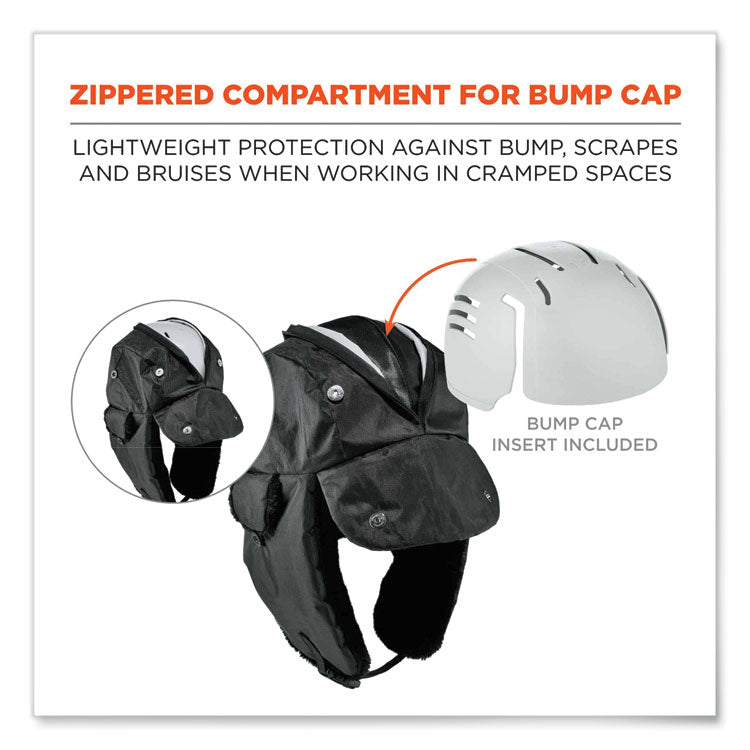 The N-Ferno 6802ZI Zippered Trapper Hat with Bump Cap Insert provides warmth from extreme cold, as well as lightweight protection from bumps, scrapes, bruises and other minor head injuries. Wear alone as a classic aviator hat or open the top zippered compartment to add the 8945 Universal Bump Cap Insert (included) for work in cramped spaces. This trapper hat features a windproof and water-resistant oxford nylon shell lined with 40 grams of 3M Thinsulate™ Insulation for comfortable warmth in extreme conditions. A water-resistant crown lining prevents sweat or moisture from being absorbed into the lining to keep you dry and warm. Ear flaps can be buttoned up for improved hearing through the small ear holes or down for increased warmth. A chin strap with YKK buckle makes for an adjustable fit, and a reflective accent on the back keeps workers safe and seen. Small/Medium—23.38" around. Hard Hat Style: Trapper Hat; Bump Cap; Material(s): Nylon; 3M Thinsulate™; Adjusting Method: Buckle; Color(s): Black.