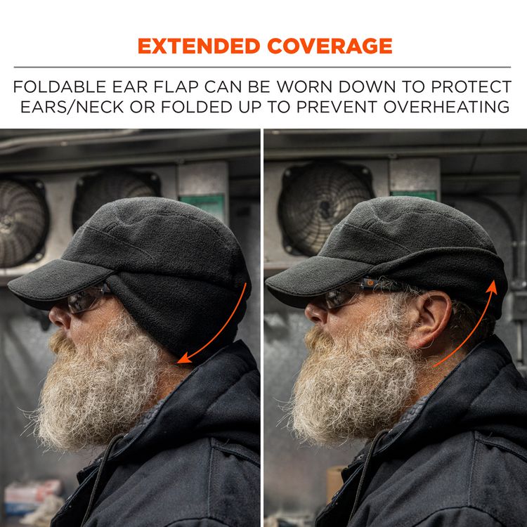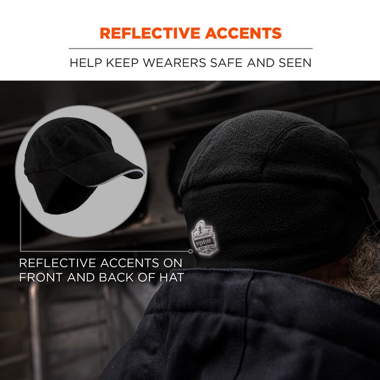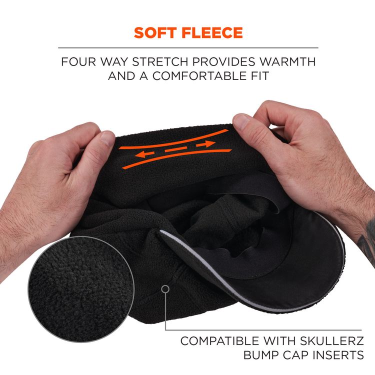 The N-Ferno 6807 Winter Baseball Cap is designed for versatile warmth in cold conditions. Made with stretchable soft fleece, this winter cap is designed to comfortably fit most head sizes. This versatile fleece cap can be worn in two ways: pull ear flaps down to protect ears and neck from cold or fold up to prevent overheating. The curved bill protects the face against sun, snow and rain. Reflective piping along the brim and a reflective logo patch on the back enhances visibility to keep wearers safe and seen. Wear this soft fleece baseball cap alone or add the Skullerz 8945 and 8945F(x) Universal Bump Cap Inserts (sold separately) for protection against bumps, scrapes, bruises and other minor head injuries when working in cramped spaces. An interior elastic band helps keep the bump cap in place when being worn. One size fits most, this winter baseball cap is ideal for those working in construction, transportation, warehousing, refrigerated areas or weekend activities. Apparel Type: Hat; Material(s): Fleece; Color(s): Black; Color Family: Black.