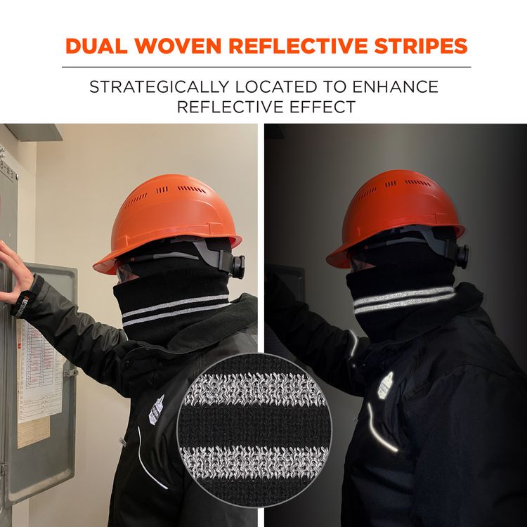 The N-Ferno 6961 Winter Neck Gaiter with reflective accents provides warm, no-bulk protection from demanding winter conditions while also enhancing visibility in low-light environments. The 100% stretchable acrylic shell with a soft liner makes for a snug, cozy fit that keeps cold out. Low-profile for wear alone or under hard hats. Unique to this neck warmer are two 360° reflective stripes to keep wearers safe and seen. Strategically placed close to one another, the stripes enhance reflectivity at all angles and create a larger overglow effect when they come into contact with light. They are sewn directly into the gaiter to reduce tears and rips when being stretched or worn. A soft interior makes for a comfortable, cozy fit. This versatile neck warmer can be worn around the neck or pulled over the mouth, nose and ears. One size fits most, this neck gaiter is ideal for those working in low-light environments or at night in construction, transportation or weekend activities. Apparel Type: Neck Gaiter; Material(s): Acrylic; Color(s): Black; Color Family: Black.