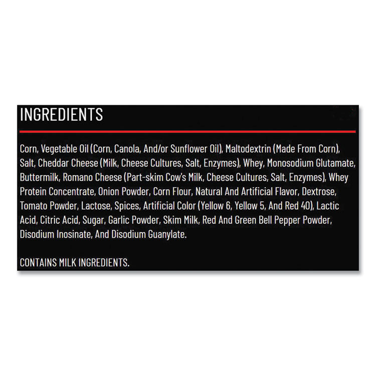 The chip that packs a flavorful punch with the classic crunch. Boldly seasoned with three cheeses, tomatoes, onions and a savory blend of spices. Indulge yourself or share with large gatherings. Food Type: Chips; Flavor: Nacho Cheese; Capacity (Weight): 1.75 oz; Product Packaging: Bag.
