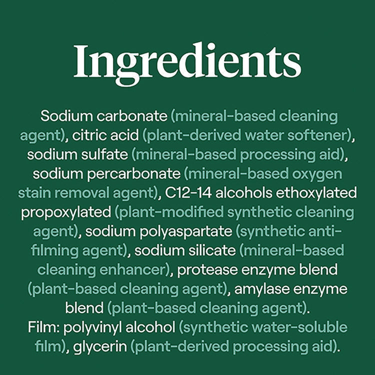 No mess, no worries, no residue. Easy-to-use packets give the perfect amount of grease-fighting power for a total clean, leaving no iffy scents behind. Simply place one single-use packet into dishwasher to remove grease, grime and even dried, stuck-on food. Enzyme-rich formula cleans without phosphates or chlorine. Free & Clear of dyes and fragrances. Scent-free and a natural choice for those sensitive to scents. Application: Automatic Dishwasher Detergent; Applicable Material: Ceramic; Glass; Metal; Plastic; Stainless Steel; Chemical Compound: Sodium Carbonate; Sodium Citrate; Sodium Sulfate; Sodium Percarbonate; C12-16 Alcohols Ethoxylated Propoxylated; Sodium Silicate; Sodium Polyaspartate; Protease; Amylase; Polyvinyl Alcohol; Dirt Types: Baked-On Food; Egg Yolk; Olive Oil; Starch Mix.
