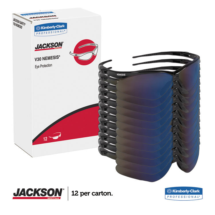 KleenGuard™ Personal Protective Equipment (PPE) enables rather than inhibits allowing for maximum productivity and safety for you and your employees. Giving your employees what they need to do their job safely and effectively is a top priority of any business owner. KleenGuard™ Nemesis Safety Eyewear's stylish good looks and durable, lightweight construction are just some of the reasons why millions of people wear them for protection both at work and at home. Nemesis Safety Glasses have KleenVision™ Anti-Fog coated polycarbonate lenses that provide 99.9% UVA/UVB/UVC protection to help prevent eye damage like cataracts, retinal damage, and other conditions that can cause temporary vision loss. The wraparound frame has a base curve of eight that extends the range of peripheral protection, as well as soft-touch temples for comfort. The Nemesis safety glasses have a patented nose piece designed to be extremely flexible, to channel sweat away from the eyes, and to help prevent slippage down the nose, all for long-term comfort. Each pair of KleenGuard™ Nemesis safety glasses come with a neck cord for securing them, so that the glasses are ready to protect at a moment's notice. Both men and women will find these stylish glasses to be comfortable and functional for construction, manufacturing, shooting range and a host of other industries. Remember: comfort and style drive compliance, so it pays to provide comfortable designer glasses that your staff will be proud to wear. Making the right Personal Protection choice is difficult. Perform with distinction with KleenGuard™ Personal Protective Equipment (PPE). Safety Glasses Style: Wraparound; Frame Color: Black; Lens Material: Dual Polycarbonate; Lens Tint: Blue Mirror.