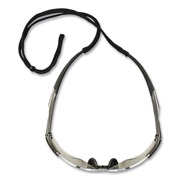 Ultra-lightweight frameless design. No-brow design increases upwards peripheral vision and limits interference with hard hat suspension systems. Polycarbonate lenses provide 99.9% UVA/UVB/UVC protection to help prevent eye damage like cataracts, retinal damage, and other conditions that can cause temporary vision loss. The wraparound frame has a base curve of 8.25 that extends the range of peripheral protection, as well as soft touch temples for comfort. Each pair of glasses come with a neck cord for securing them, so that the glasses are ready to protect at a moment's notice. The safety eyewear is manufactured to comply with the ANSI / ISEA Z87.1+ standard for personal eye protection. Safety Glasses Style: Wraparound; Frame Color: Gunmetal; Lens Material: Polycarbonate; Lens Tint: Clear.