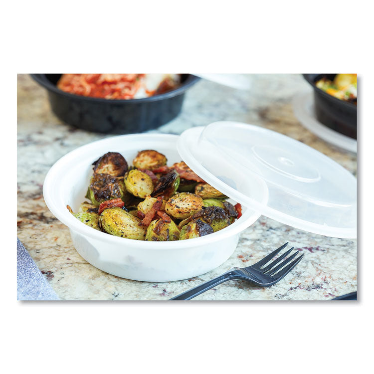 Newspring VERSAtainer Microwavable Containers, Round, 35 oz, 8 x 8 x 2.5, White/Clear, Plastic, 150/Carton