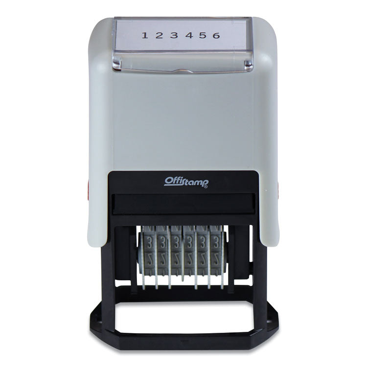 Speed through document processing by using this number stamp, which prints up to six digits. Featuring durable plastic construction, this self-inking number stamp comes with an extra replacement pad, ensuring years of continued reliable use. Stamp Type: Numberer; Ink Types: Pre-Inked; Re-Inkable; Impression Width: 1.88"; Impression Height: 0.25".
