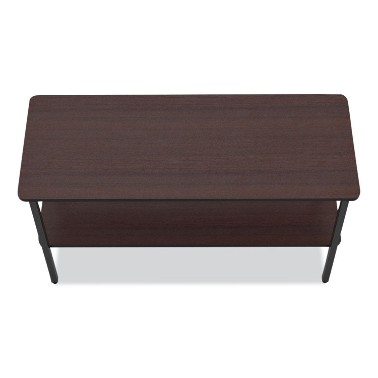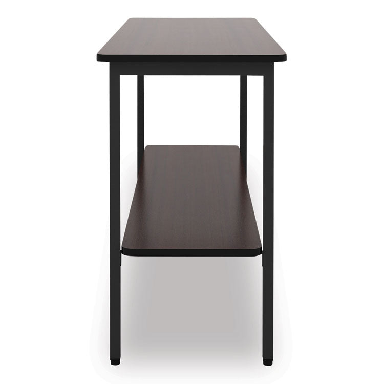 An easy, economical way to expand your available worksurface and storage space. OfficeWorks™ Utility Tables go anywhere you need them. Thick, laminated-woodgrain tabletop and storage shelf provide plenty of space for a variety of tasks, from simply sorting records and files to more involved product packaging, shipping and receiving activities. Sturdy, 1" square metal legs with matching, enamel-finished 2.5" wide metal apron delivers a solid foundation to ensure you worksurface remains stable. Plastic glides affixed to the ends of each leg help protect your flooring. Top Color: Walnut; Color Family: Walnut; Base Color: Black; Top Shape: Rectangular.