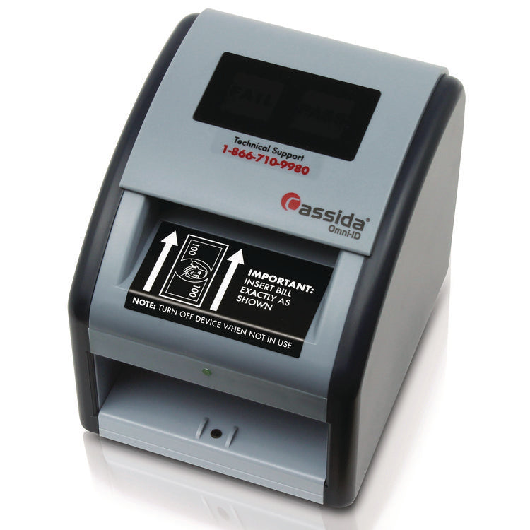 According to the U.S. Department of Treasury, there is an estimated $70 million in counterfeit currency in circulation. Defend your business from counterfeits instantly with the Omni-ID! The Omni-ID scans a bill in less than a second and cross-references it over a comprehensive database of infrared, magnetic and ultraviolet markings to confirm its authenticity-all in an easy-to-use platform that any employee can quickly master. In addition to guarding against counterfeit cash, the Omni-ID also includes the unique ability to check for fake identifications. Just place an identification card under the bright ultraviolet LED light and instantly see if the card has the proper identifying marks or not. Counterfeit Bill Detector Type: Infrared; Magnetic Strip Detection; UV Light; Currency: U.S.; Color(s): Gray; Width: 6".