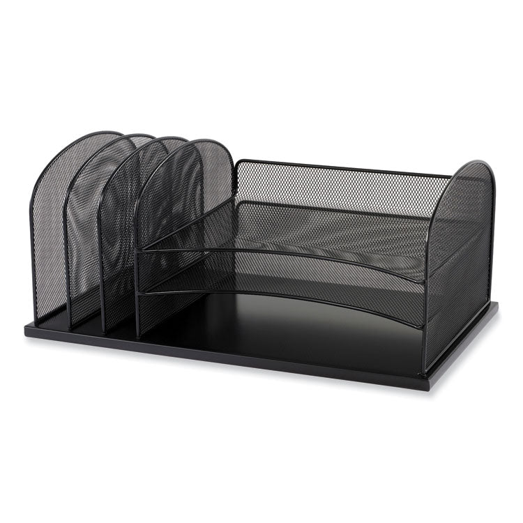 Onyx Mesh 3 Sorter/3 Tray Desktop Organizer is manufactured with strong, commercial-grade steel and a powder coat finish to stand up to years of heavy use. Organizer features three horizontal trays for storing letters, files and loose documents and three 2" wide vertical sorters for folders, binders and notebooks. Place this file organizer in cubicles, home offices, mailrooms, family rooms and kitchens to help declutter surfaces and organize your workspace. The Onyx stylishly designed steel mesh products make it easy to create a sleek, professional, organized workspace. Number of Compartments: 6; For File Size: Letter; Load Orientation: Front; Color(s): Wine.