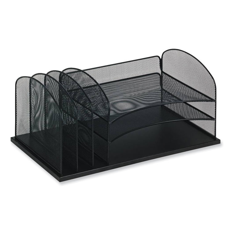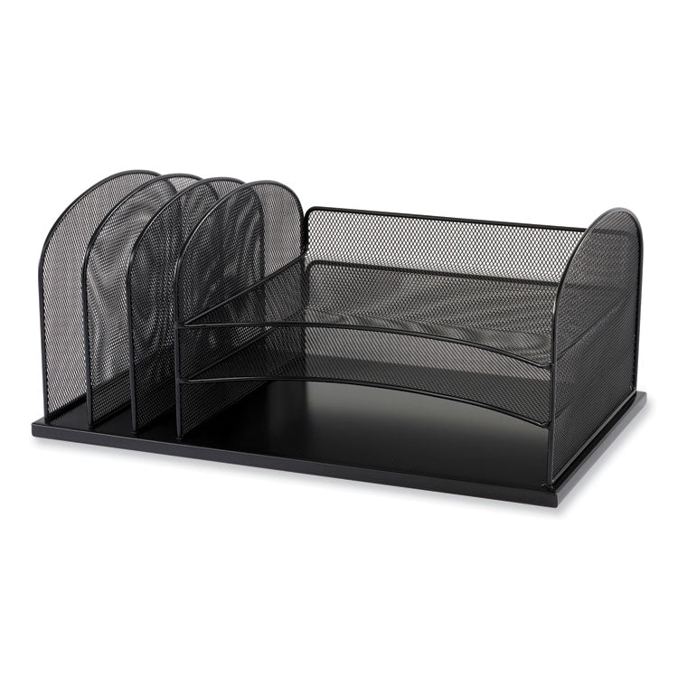 Onyx Mesh 3 Sorter/3 Tray Desktop Organizer is manufactured with strong, commercial-grade steel and a powder coat finish to stand up to years of heavy use. Organizer features three horizontal trays for storing letters, files and loose documents and three 2" wide vertical sorters for folders, binders and notebooks. Place this file organizer in cubicles, home offices, mailrooms, family rooms and kitchens to help declutter surfaces and organize your workspace. The Onyx stylishly designed steel mesh products make it easy to create a sleek, professional, organized workspace. Number of Compartments: 6; For File Size: Letter; Load Orientation: Front; Color(s): Blue.
