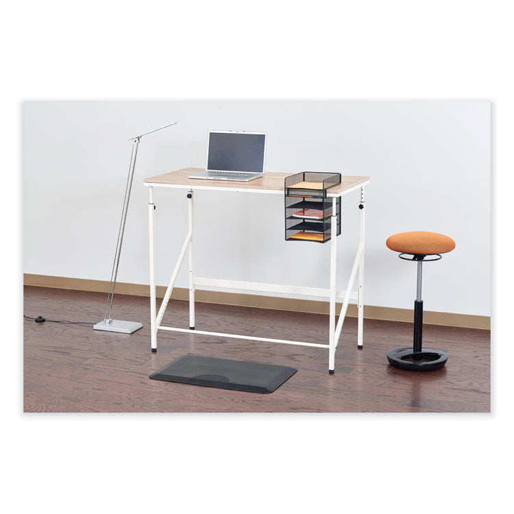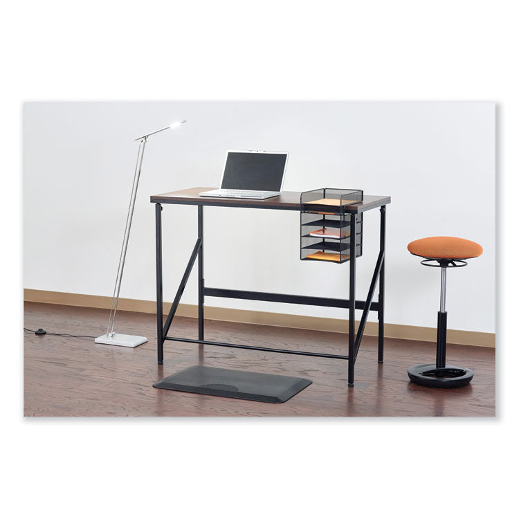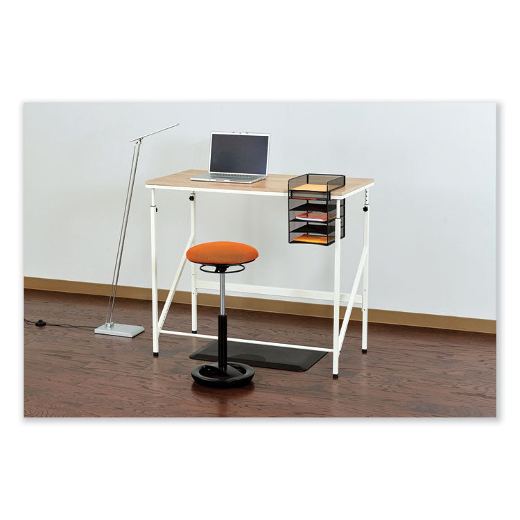 The Onyx™ horizontal hanging storage unit is a wire mesh organizer that easily attaches to a desktop and hangs below it, providing underdesk storage that saves space and time. Features one desktop tray and four underdesk trays for sorting letter-size documents, folders and files. It also has an underdesk pencil tray for storing pens, pencils and other supplies. The hanging storage design keeps your desktop clutter free and pairs well with standing-height or adjustable-height desks or tables. This sleek mesh organizer attaches to surfaces up to 1.75 thick and includes a rubber-headed tightening screw so that it can be securely mounted without damaging the surface. Created with a steel base and powder coat finish for added durability. Number of Compartments: 5; For File Size: Letter; Load Orientation: Front; Color(s): Black.