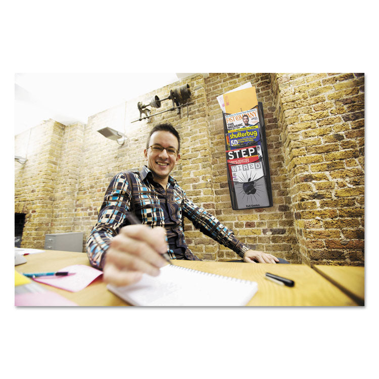 A contemporary look in magazine racks that will fit into any setting. Perfect for use in a front office, reception area or work area for keeping literature close at hand. Wall mounting hardware included. Features black powder coat finish for durability. Color(s): Black; Color Family: Black; Overall Width: 10.25"; Overall Depth: 3.5".