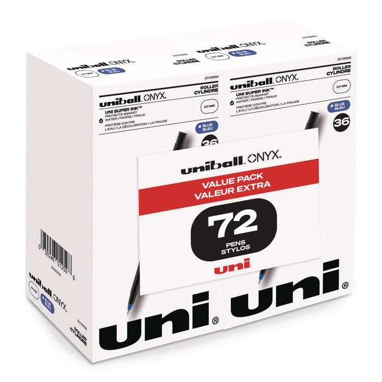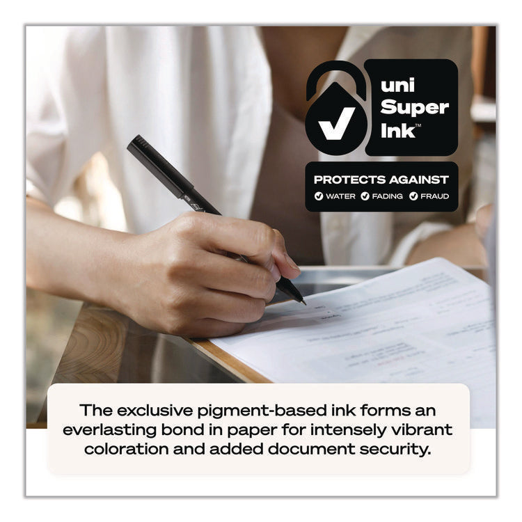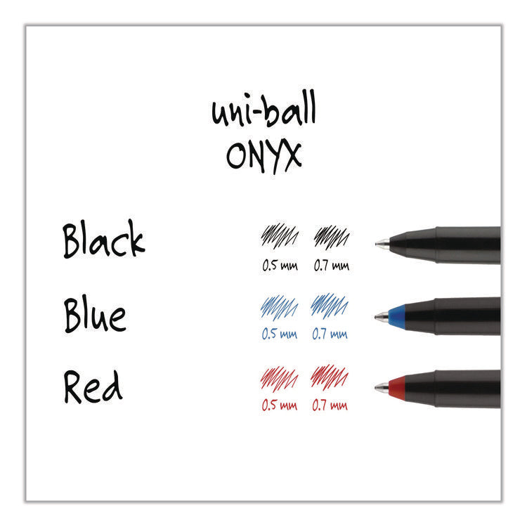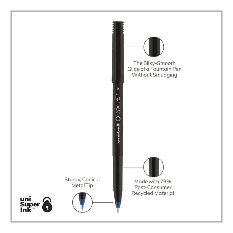 Stock your office, home or classroom with Onyx Rollerball Stick Pens from uni-ball featuring strong, long lasting tip sizes. This rollerball pen delivers the silky-smooth glide of a fountain pen without smudging for effortless writing. ONYX pens produce crisp and precise lines for intricate writing, making it easy to create super fine details in your drawings and diagrams. Capped roller pens are useful for a variety of tasks from note taking to signing checks and legal documents to uniquely embellishing fun and creative writing projects. Innovative uni Super Ink technology forms a strong bond with the paper, protecting from water, fading and fraud. A great economic and environmentally-conscious choice as this super sleek micro point roller pen is made from post-consumer recycled material. Pen Sub-Brand & Product Family: ONYX®; Pen Type: Rollerball Pen; Pen Style: Stick; Pen Tip Type: Conical.