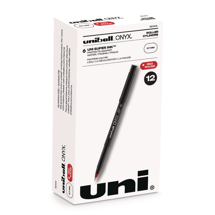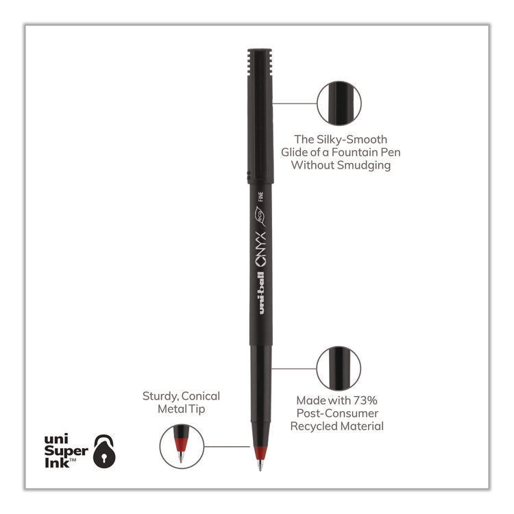 Stock your office, home or classroom with Onyx Rollerball Stick Pens from uni-ball featuring strong, long lasting tip sizes. This rollerball pen delivers the silky-smooth glide of a fountain pen without smudging for effortless writing. ONYX pens produce crisp and precise lines for intricate writing, making it easy to create super fine details in your drawings and diagrams. Capped roller pens are useful for a variety of tasks from note taking to signing checks and legal documents to uniquely embellishing fun and creative writing projects. Innovative uni Super Ink technology forms a strong bond with the paper, protecting from water, fading and fraud. A great economic and environmentally-conscious choice as this super sleek micro point roller pen is made from post-consumer recycled material. Pen Sub-Brand & Product Family: ONYX®; Pen Type: Rollerball Pen; Pen Style: Stick; Pen Tip Type: Conical.