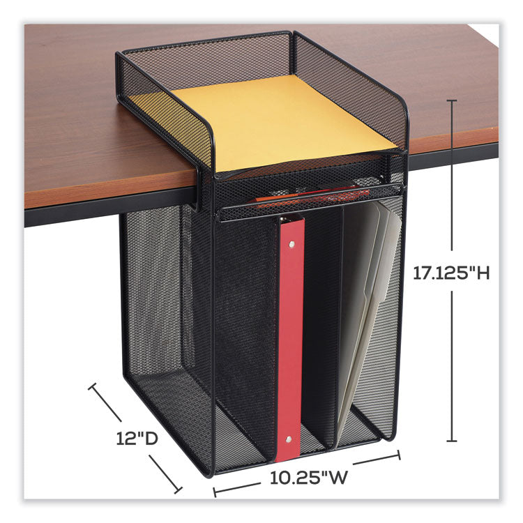 The Onyx™ horizontal hanging storage unit is a wire mesh organizer that easily attaches to a desktop and hangs below it, providing underdesk storage that saves space and time. Features one desktop tray and three underdesk trays for sorting letter-size documents, folders and files. It also has an underdesk pencil tray for storing pens, pencils and other supplies. The hanging storage design keeps your desktop clutter free and pairs well with standing-height or adjustable-height desks or tables. This sleek mesh organizer attaches to surfaces up to 1.75 thick and includes a rubber-headed tightening screw so that it can be securely mounted without damaging the surface. Created with a steel base and powder coat finish for added durability. Number of Compartments: 4; For File Size: Letter; Load Orientation: Front; Color(s): Black.