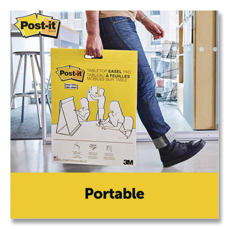 It's an amazing feeling when your team just clickseveryone feels a shared drive toward success. But, how do you ignite that feeling on every team? Capture the spark at your next meeting with Post-it® Super Sticky Easel Pads. Adhesive backed sheets stick and re-stick to hold up to 2X longer to most wall surfaces, unlike flip chart paper. The paper resists marker bleed through so you can capture input by writing directly on the sheet. Use with Post-it® Super Sticky Notes to organize ideas. Download the free Post-it® App to instantly capture and save your work so you can share notes with the team without recaps or delays. Original Tabletop Easel with Self-Stick Sheets. Pocket-Sized Indicator: N; Pad-Binding Type: Stapled; Pad-Binding Edge: Top; Number of Subjects/Sections: 1.