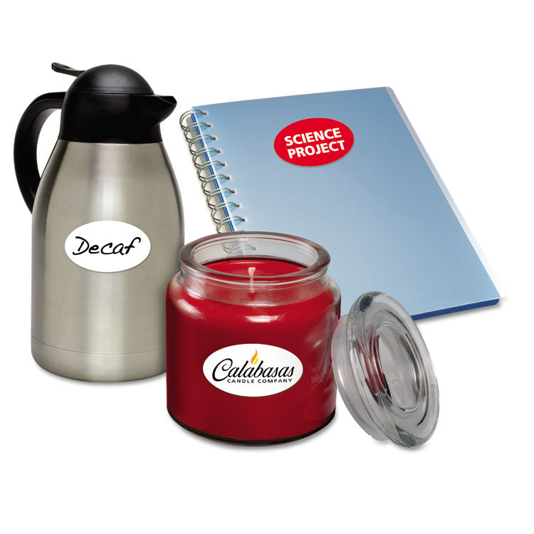 Make your product or promotion stand out in a crowd! These customizable oval labels offer just the marketing pop you need. Sure Feed® technology ensure reliable feed through printers and copiers. Backed with permanent adhesive, the labels stick to glass, plastic, paper and more, allowing you to put your mark on nearly any product. With free templates and designs from Avery® Design & Print Online, you can easily customize the labels with your unique marketing strategy in mind. New customizable marketing solutions are just a few clicks away with these premium labels. Matte Finish with Easy Peel®—For fast peeling, simply bend the Easy Peel® sheet to expose the Pop-up Edges®. Shape: Oval; Label Size - text: 1.5 x 2.5; Label Color(s): White; Color Family: White.