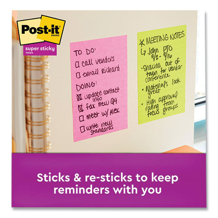 Post-it® Super Sticky Notes have 2X the sticking power to help you organize and keep on top of any project. Colors are from our Supernova Neons collection. Ideas are out of this world with the electric colors of the Supernova Neon collection. Sort your project by color and subject, and accomplish more. Post-it® Super Sticky Notes are recyclable and stick again and again and allow to move your notes with you throughout your day. Cabinet PackIncludes 24 pads in a convenient tray to help you keep your supplies neat and organized. Self-Stick Pad Type: Super-Sticky Large-Format; Shape: Rectangular; Color(s): Supernova Neons Collection; Color Family: Multicolor.