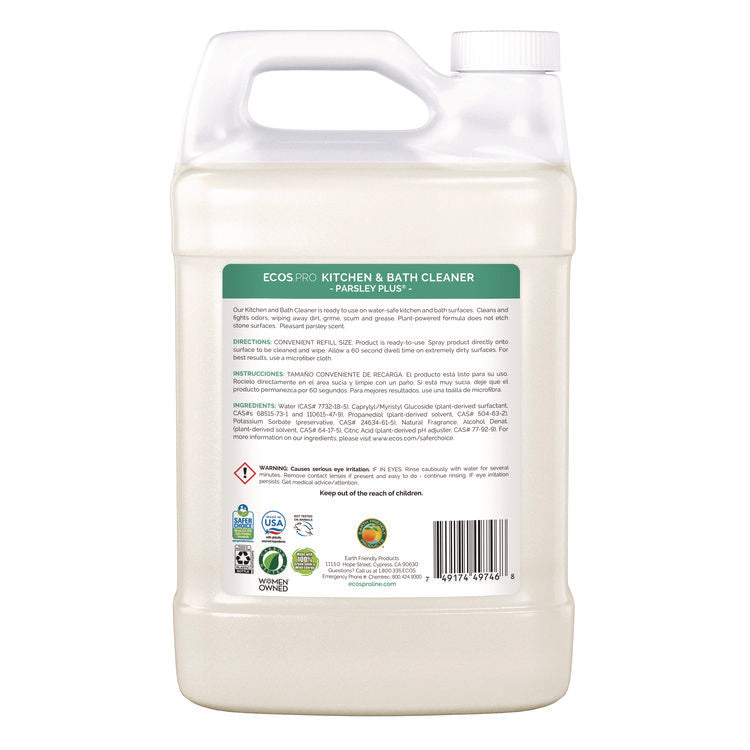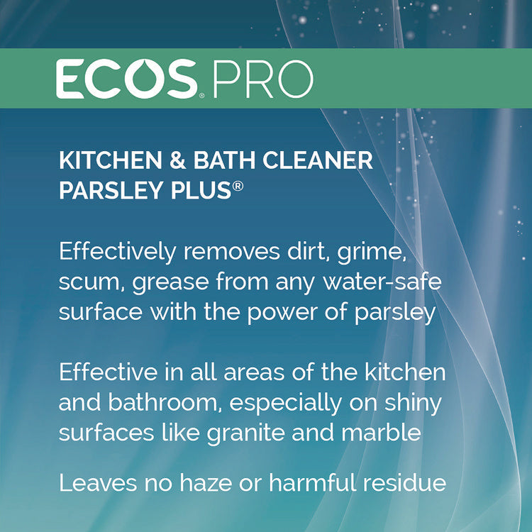 The ECOS PRO Parsley Plus all-purpose kitchen and bathroom cleaner and degreaser washes and fights odors with the natural power of parsley. This pH-balanced formula removes dirt, grease, grime, and scum from water-safe surfaces. Cleans and shines all areas of the kitchen and bathroom; works exceptionally well on granite and marble, leaving no haze or residue even on high-shine stone surfaces. Made using sustainable, plant-powered ingredients. Made without dyes; gray water and septic safe. Features a pleasant parsley scent. Not tested on animals. Manufactured in a facility that is LEED Zero Carbon, LEED Zero Waste, and LEED Zero Energy Certified. Application: All-Purpose; Applicable Material: Water-Safe Hard Surfaces; Chemical Compound: Caprylyl/Myristyl Glucoside; Propanediol; Potassium Sorbate; Alcohol Denat.; Citric Acid; Dirt Types: Dirt; Grease; Grime.
