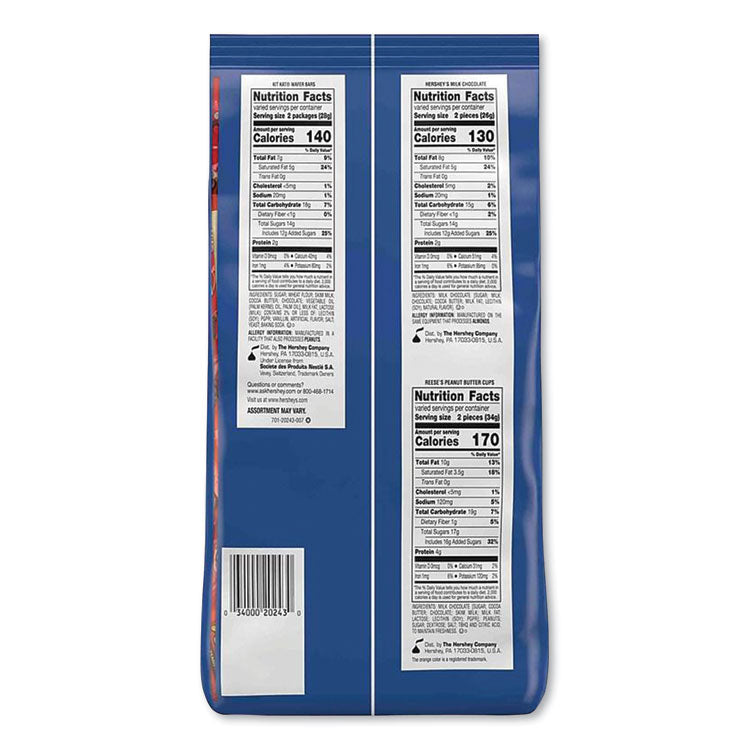 Be the hit of the party with the Hershey Miniatures Candy Assortment Party Pack. Great for sharing with family and friends, these bite-size assorted candies offer the perfect sweet treat for holiday parties, movie nights, lunch desserts or anytime snacking. This package of party candy contains a variety of classic candy miniatures sure to satisfy your sweet tooth, including Hershey's Milk Chocolate Bars, Reese's Peanut Butter Cups, Kit Kat® Wafer Bars and Reese's Pieces Candy. The candy mix contains approximately 93 individually wrapped pieces. Food Type: Candy; Flavor: Hershey®'s Milk Chocolate; Kit Kat®; Reese's® Peanut Butter Cups; Reese's® Pieces; Capacity (Weight): 33.38 oz; Sugar Free: No.