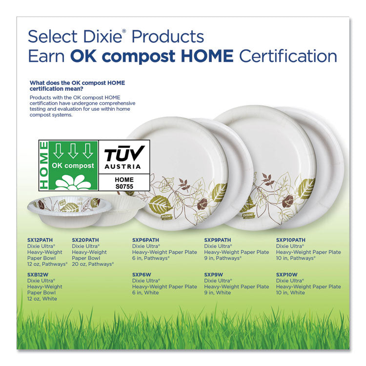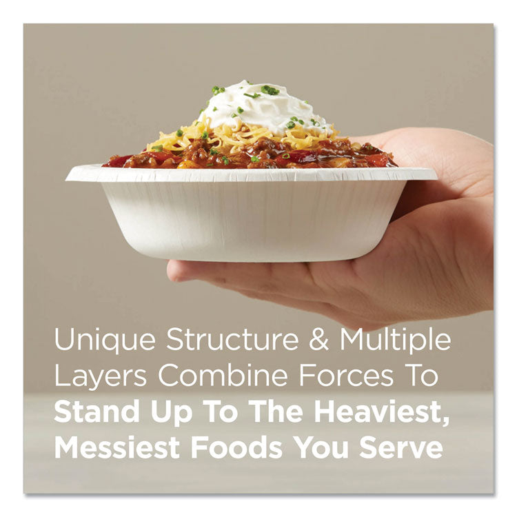 Moisture resistance, grease resistance and dry and wet rigidity make Dixie Ultra® Heavy-Weight Paper Bowls the right choice for the heaviest, messiest foods you serve. The unique structure and multi-layer coatings give these disposable paper bowls their strength, while the Soak-Proof Shield helps keep moisture and grease from leaking through. The Pathways® design matches other Dixie Ultra® plates, platters, bowls and cups to create an attractive, coordinated look. These heavy-duty paper bowls are ideal for foodservice and special events, and because they're microwaveable and cut-resistant, these small paper bowls come in handy in kitchens and breakrooms. Dinnerware Type: Bowl; Material Type: Paper; Material(s): Paper; Interior Volume Capacity: 20 oz.