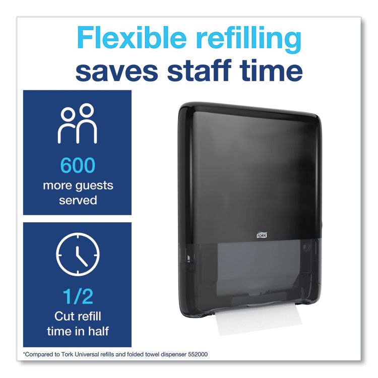 Tork® PeakServe® Continuous® Hand Towel Dispenser is the latest innovation designed for high-traffic washrooms where staff needs to maximize cleaning time and maintain a good flow of guests. Compatible with Tork PeakServe Continuous hand towels, the system offers very high capacity, which can be dispensed quickly and without interruption to keep the flow. The compressed refills are fast to fill, can be topped up at any time and are easy to store and transport, enabling staff to focus on cleaning, not refilling. Towels served in three seconds for washroom flow with no hold ups for guests. Compression means more hand towels, preventing unexpected run outs as compared to traditional towel systems. Top up with hand towels when it suits you. More flexibility means more time to clean. Taking a towel is always smooth and easy with our patented Continuous hand towel system. EasyCube® compatible. Towels Dispensers Type: Continuous® Towel Dispenser; Dispenser Capacity (text): 1,230 Towels; Material(s): Plastic; Color(s): Black.
