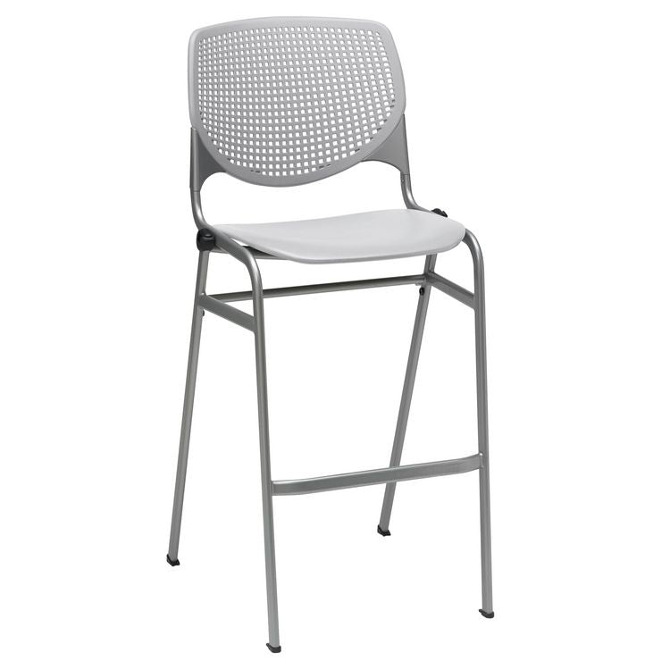 Contemporary and comfortable breakroom/cafeteria furniture. Table and 4 barstool set. This pedestal table has a 1.25" thick high-pressure laminate top that's durable and easy to clean. The top has an attractive edge that won't crack or peel. The solid cast iron round base has leveling glides to prevent the table from wobbling on uneven floors. The steel column has a 3" diameter and is made of 16-gauge steel. The top and base are all shipped in one box. Easy to assemble. The barstool has an easy to clean polypropylene seat and back. The ergonomic perforated back allows for enhanced circulation, while the radius conforms to your back for maximum comfort. The chair offers a contoured extra wide seat pan and a 400-lb weight capacity to provide comfort and accommodate all sizes. The oval frame is made of 15-gauge steel with silver powder-coat. The 2300 is one of most complete stack chairs on the market. It's just plain.. KOOL. Tables shipped unassembled. Chairs shipped assembled. Top Color: Designer White; Color Family: White; Base Color: Silver; Top Shape: Round.