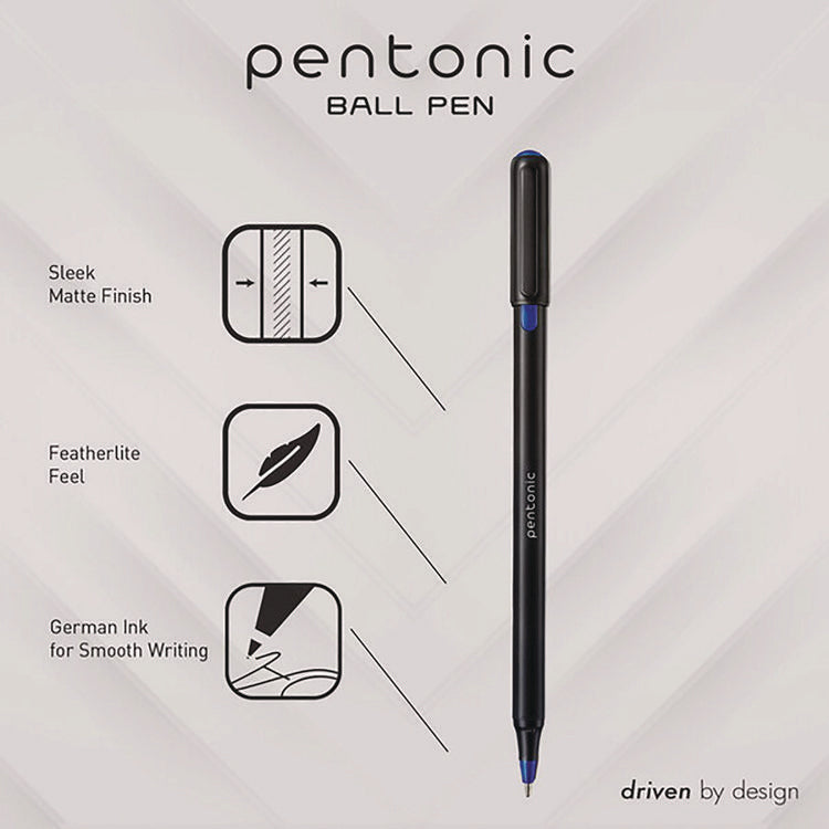 Each PENTONIC featherweight pen has a sleek finish for a comfortable grip and smooth, effortless writing and journaling. The nickel silver pen tip is 0.7 mm fine point for thin, precise lines. The low viscosity ink allows the rolling ball to glide across all kinds of paper surfaces without smearing. You get a consistent flow of ink from the very first use to the very last. The pen cap also helps to maintain the lifespan of your ballpoint pens! Pen Sub-Brand & Product Family: PENTONIC; Pen Type: Ballpoint Pen; Pen Style: Stick; Pen Tip Type: Conical.