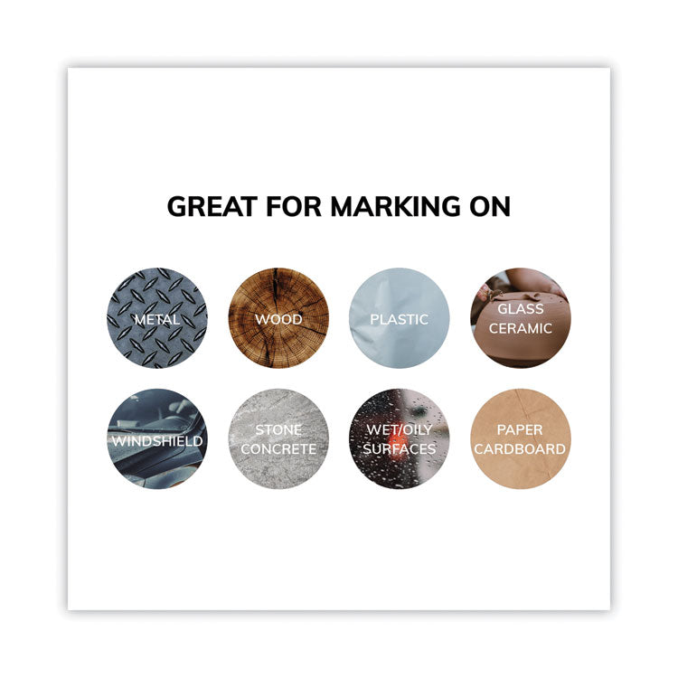 Create permanent and accurate marks on virtually any surface with uni Paint oil-based paint markers from uni-ball. These markers deliver strong and clearly visible lines. Quick-drying paint is water, fade, heat and abrasion resistant. Valve action control provides excellent flow and coverage, while also preventing the marker from drying out if left uncapped. Permanent paint colors mark opaque and glossy on both light and dark surfaces, no matter what it is applied to. The metal barrel and durable tip ensures a long marking life. Ideal for manufacturing, construction sites, automotive, metal fabrication, aviation, marking oily, greasy items and identifying parts or equipment outside. Marker Ink Type: Permanent; Marker Tip Type: Bullet; Marker Tip Size (text): Fine; Marker Color(s): White.