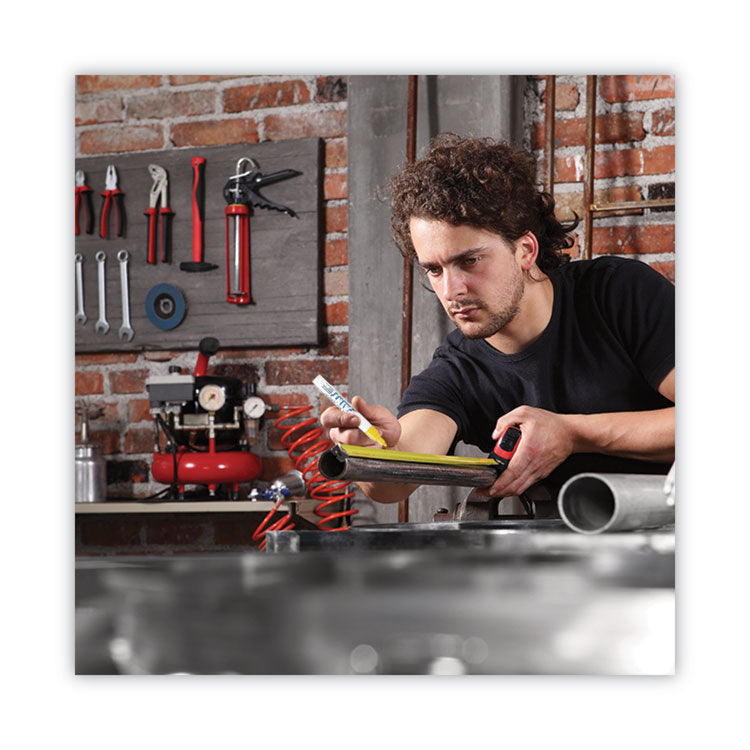 Create permanent and accurate marks on virtually any surface with uni Paint oil-based paint markers from uni-ball. These markers deliver strong and clearly visible lines. Quick-drying paint is water, fade, heat and abrasion resistant. Valve action control provides excellent flow and coverage, while also preventing the marker from drying out if left uncapped. Permanent paint colors mark opaque and glossy on both light and dark surfaces, no matter what it is applied to. The metal barrel and durable tip ensures a long marking life. Ideal for manufacturing, construction sites, automotive, metal fabrication, aviation, marking oily, greasy items and identifying parts or equipment outside. Marker Ink Type: Permanent; Marker Tip Type: Bullet; Marker Tip Size (text): Fine; Marker Color(s): Yellow.