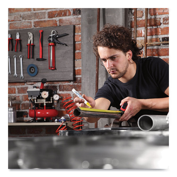 Create permanent and accurate marks on virtually any surface with uni Paint oil-based paint markers from uni-ball. These markers deliver strong and clearly visible lines. Quick-drying paint is water, fade, heat and abrasion resistant. Valve action control provides excellent flow and coverage, while also preventing the marker from drying out if left uncapped. Permanent paint colors mark opaque and glossy on both light and dark surfaces, no matter what it is applied to. The metal barrel and durable tip ensures a long marking life. Ideal for manufacturing, construction sites, automotive, metal fabrication, aviation, marking oily, greasy items and identifying parts or equipment outside. Marker Ink Type: Permanent; Marker Tip Type: Bullet; Marker Tip Size (text): Medium; Marker Color(s): Pink.