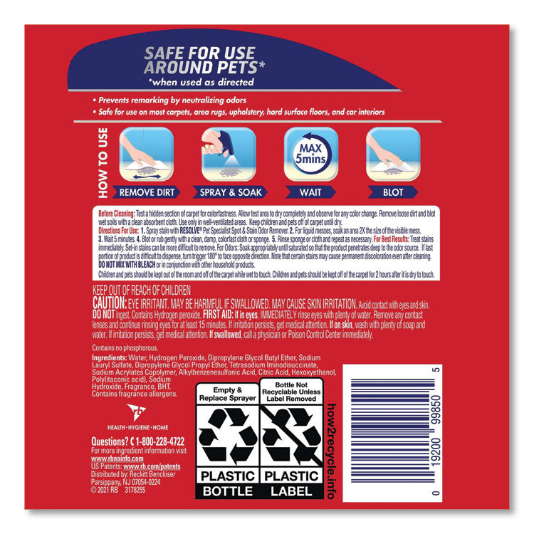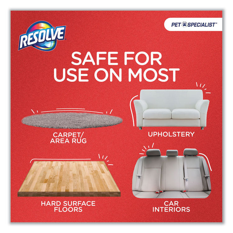 RESOLVE® Pet Specialist™ Stain & Odor Remover lifts and removes tough set-in stains like feces, vomit, dirt and their odors up to seven days old. Also prevents remarking by neutralizing odors. It's safe for use around pets when used as directed. This formula makes carpet, floor and upholstery cleaning super easy! It destroys tough set-in stains the first time and it is safe to use on most carpet, rug, upholstery, hard surface floors and car interiors. Application: Carpet/Upholstery Cleaner; Applicable Material: Area Rugs; Car Interiors; Carpet; Hard Surface Floors; Uphostery; Chemical Compound: Hydrogen Peroxide; Dirt Types: Pet Dirt; Pet Feces; Pet Odors; Pet Urine; Pet Vomit.