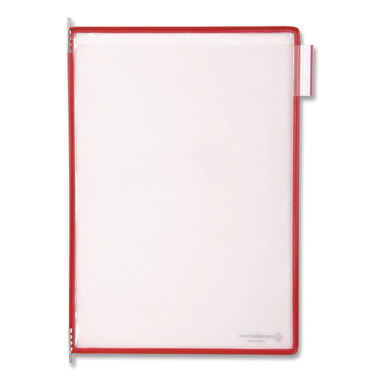 Streamline your workspace with djois® by Tarifold Pivoting Pockets, the ultimate solution for displaying and accessing your documents efficiently. Designed for versatility, these letter-size pockets are compatible with wall, desk or rotary systems, adapting seamlessly to your needs. Each pocket pivots smoothly, making it easy to browse, update and organize essential information. Built to last, they offer durability and clarity for heavy daily use in offices, schools or industrial settings. These pockets are perfect for creating accessible reference systems that boost productivity and keep you focused! Number of Compartments: 10; Compartment Capacity: 2 Sheets; Color(s): Red; Border Color(s): Red.