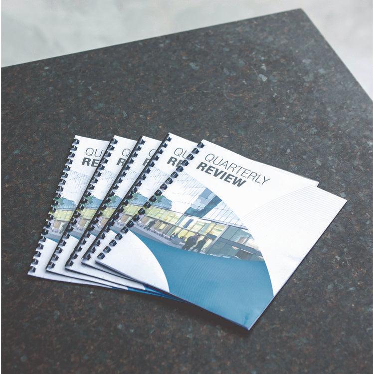 Get a professional edge! Plastic comb binding creates easy-to-handle documents with a high-quality, custom look. For use with Fellowes® or any standard 19-ring comb-binding system. Sheet Capacity: 340; Spine Diameter: 1 1/2"; Number of Rings: 19; Color(s): Black.
