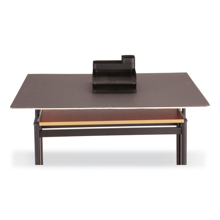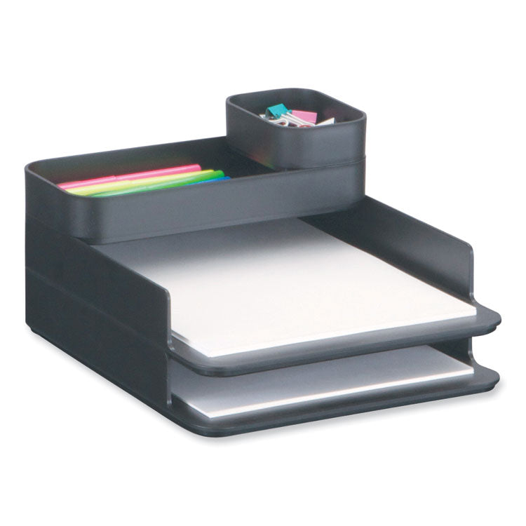 This stacking plastic desktop sorter set is a combination desktop organizer that consists of four stacking components that can be separated from each other as desired. It features two letter sorting trays underneath a large supply storage tray and a small supply storage tray. Rounded corners provide an aesthetically pleasing and unique design. Number of Compartments: 4; For File Size: Letter; Load Orientation: Front; Color(s): Black.