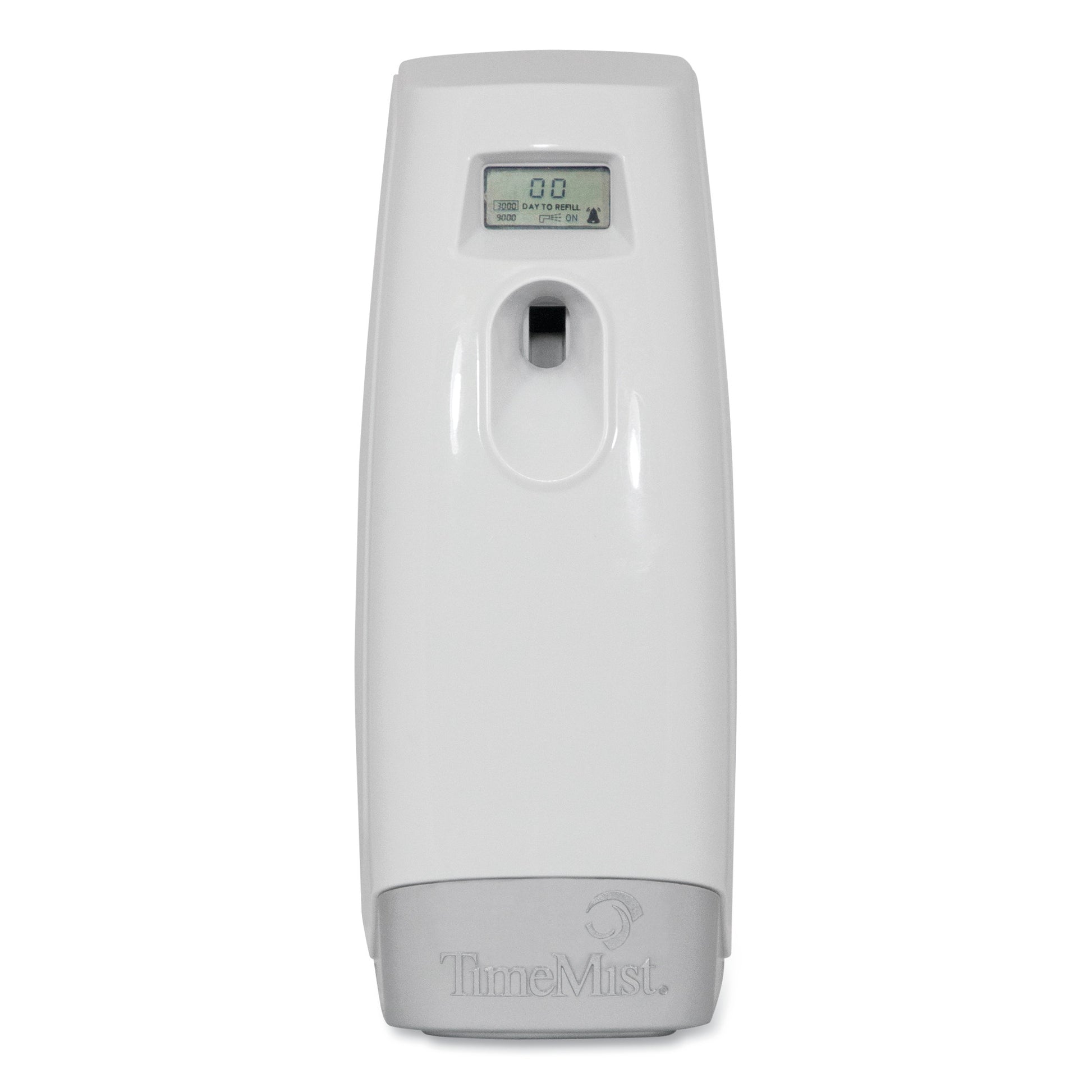 Programmable start/stop time and spray interval with settings for light, medium and heavy. Automatic setting sprays every 15 minutes, 24 hours a day, for 30 days. Dispenser features LED service and battery reminders. Operates up to one year on two C batteries (sold separately). Material(s): Plastic; Color(s): White; Height: 9"; Width: 2.5".