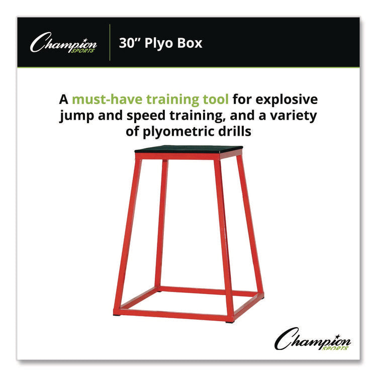 Champion Sports Plyo Boxes are a must-have training tool for explosive jump and speed training, and a variety of plyometric drills! Made of welded tubular steel, this plyo box feature a slip-resistant, rubber-coated plywood landing surface, and the legs are constructed at an angle for extra stability. 17" x 17" Top, 30" h. Length: 24"; Width: 24"; Material(s): Plywood; Rubber; Steel; Playground/Gymnasium Sets Type: Plyo Box.