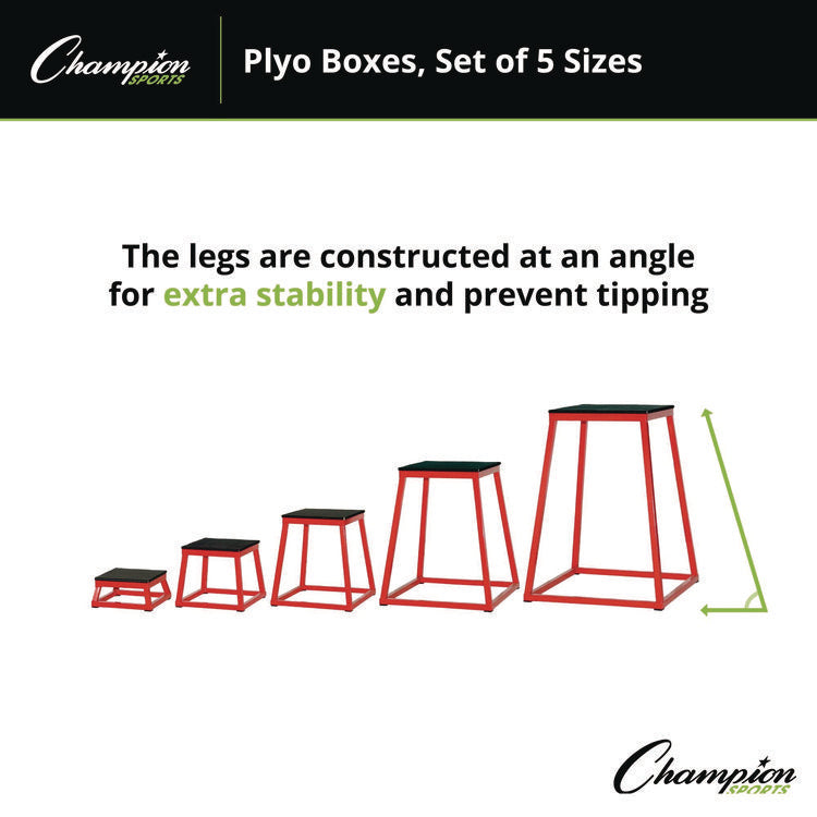 Increase explosive vertical jump power and speed with Champion Sports Set of Five Plyo Boxes. Used in a variety of plyometric drills and speed training. The plyo box acts as a stable landing surface thanks to the slip-resistant rubber-coated pad. Made of welded steel and constructed at a six-degree angle to prevent tipping. This set of five sturdy plyo boxes are a perfect way to improve your jumping skill and speed. Length: 13"; 15"; 18"; 21"; 24"; Material(s): Plywood; Rubber; Steel; Playground/Gymnasium Sets Type: Plyo Box Sets; Quantity: 5/Set.