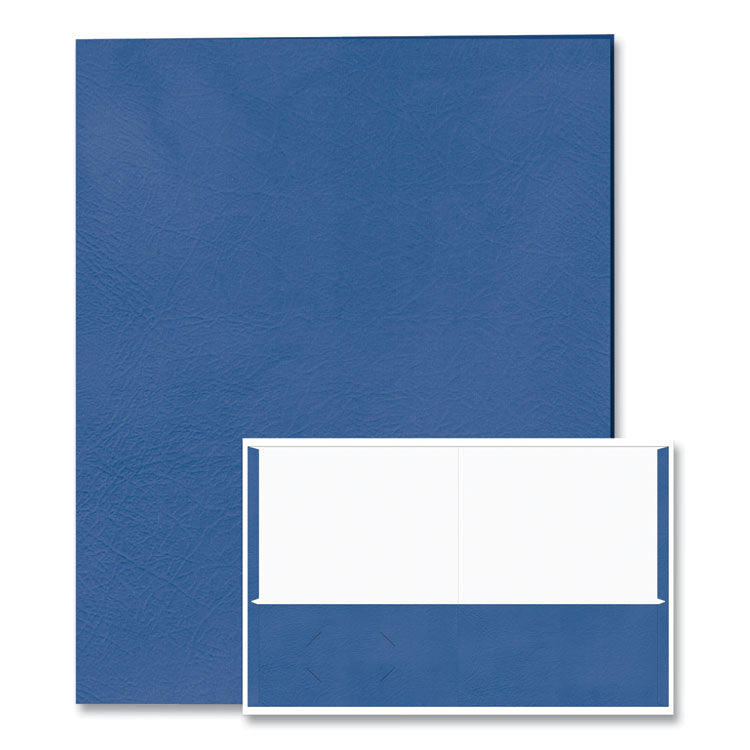 These folders have an embossed leatherette finish. The color is printed on durable white tag stock. Two inside pockets keep papers in place. Front Cover Color(s): Dark Blue; Color Family: Blue; Back Cover Color(s): Dark Blue; Sheet Size: 11" x 8.5".