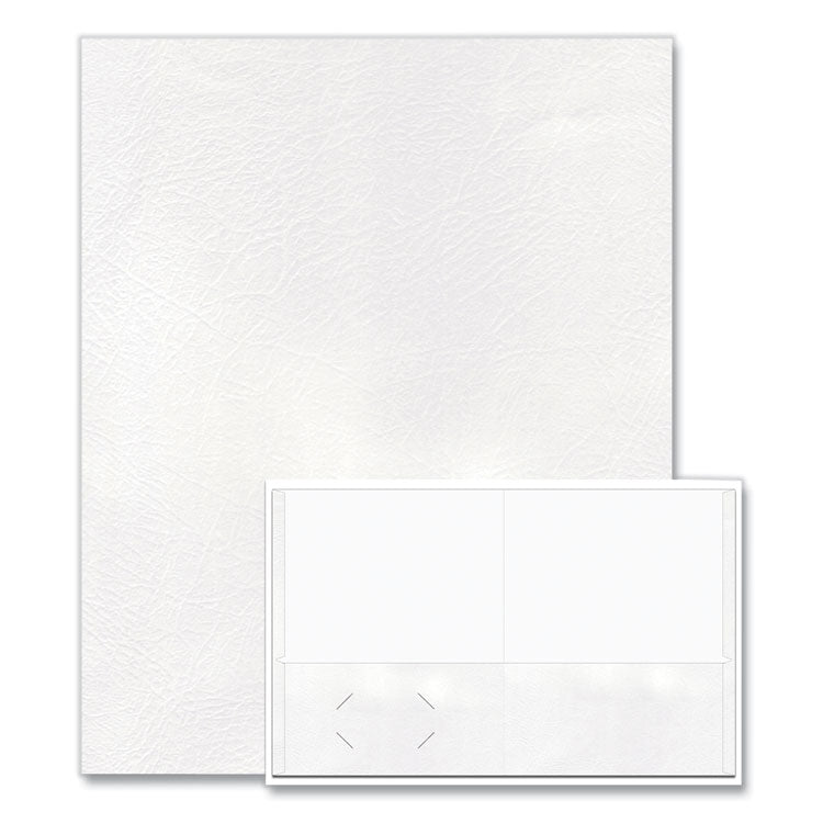 These folders have an embossed leatherette finish. The color is printed on durable white tag stock. Two inside pockets keep papers in place. Front Cover Color(s): White; Color Family: White; Back Cover Color(s): White; Sheet Size: 11" x 8.5".