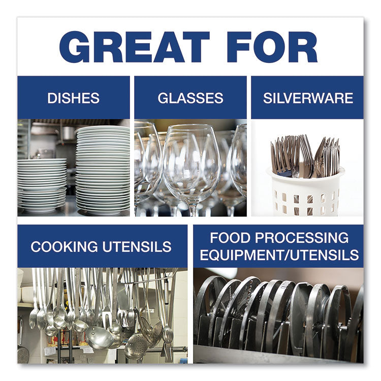 Chlorine-based, no-rinse third-sink sanitizer is ideal for food-processing equipment, glasses, utensils and more. Dries clean, without spots or streaks. Application: Dish/Glass Sanitizer; Applicable Material: Ceramics; Enamel; Fiberglass; Glass; Metal; Plastic; Dirt Types: Bacteria; Germs; Mildew; Mold; Scent: Chlorine.