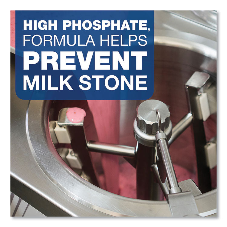Powerful powdered product cleans and sanitizes milk shake and soft serve machines. High phosphate formula helps prevent the formation of milk stones. Variable dilution ratios allow you to tailor your mixture to fit the job. Contains 6.25% sodium dichloro-s-triazinetrione dihydrate. Application: Disinfectant/Cleaner; Applicable Material: Metal; Nylon; Plastic; Rubber; Silicon; Vinyl; Dirt Types: Bacteria; Food Debris; Germs; Grime; Mildew; Organic Matter; Water-Based Soil; Scent: Chlorine.
