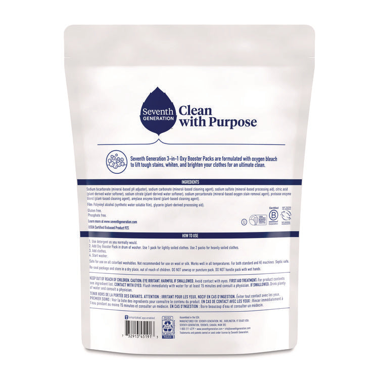 Just toss one pack in with each load with Seventh Generation laundry soap, then let its incredible 3-in-1 formula do the rest. Your family deserves a laundry booster that's effectiveour Oxy Booster Packs whiten whites and keep colors protected. You'll wonder how your laundry ever lived without them. Use with our laundry detergent, fabric softener sheets or liquid, and our stain remover spray! At Seventh Generation, we do business differently. We believe our products are healthy solutions for use within your home and for the community. We are always evaluating how to increase performance and safety, and create a more sustainable supply chain. Furthermore, we believe it is our responsibility to set a course for a more mindful way of doing business, where companies act as partners with other stakeholders to create a brighter future for the whole planet. Seventh Generation is proud to be a Certified B Corporation. B Corps are certified to be better for workers, and better for communities. By choosing Seventh Generation Laundry Detergent and Stain Remover for clothes products, you're joining us in nurturing the health of the next seven generations. Application: Laundry Detergent; Applicable Material: Clothing; Fabric; Dirt Types: Chocolate; Grass; Stains; Scent: Fragrance Free.