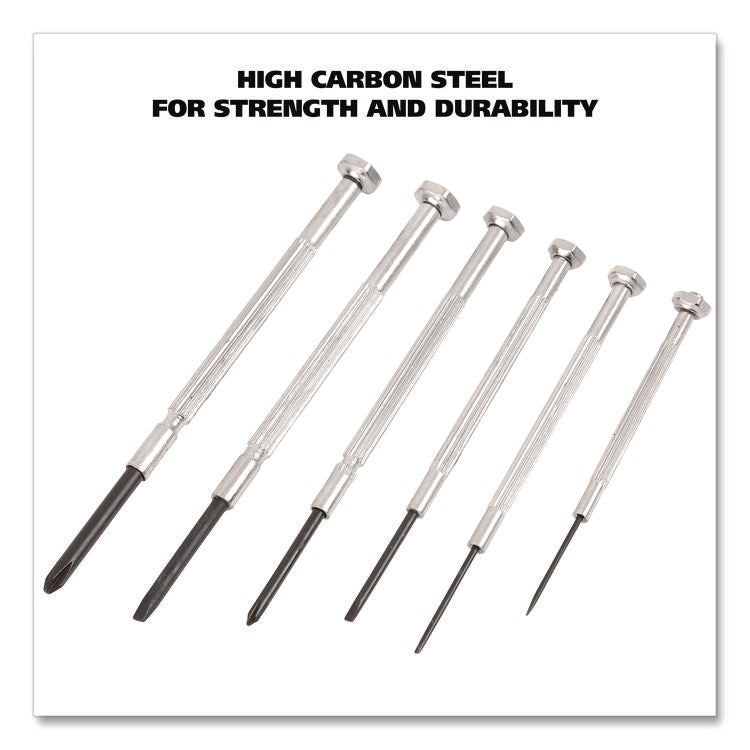 The Great Neck® Precision Screwdriver Set is ideal for detailed work. Featuring heat-treated and tempered, high-carbon steel tips and shanks as well as ribbed, polished steel handles, these screwdrivers are meant to withstand the rigors of repeated use. Use them for electronics work, eyeglass repair, musical instrument adjustments and more. To ensure neat and easy storage and convenient carrying, the included storage case provides a labeled, snap-in slot for each precision screwdriver in the set. Six-Piece Set. Screwdrivers and Nut Drivers Tool Type: Screwdriver Set; Tip/Socket Type(s): Phillips; Slotted; Tip/Socket Size(s): 0.8 mm; 1.2 mm; 1.8 mm; 3 mm; #0; #1; Overall Length: Assorted.