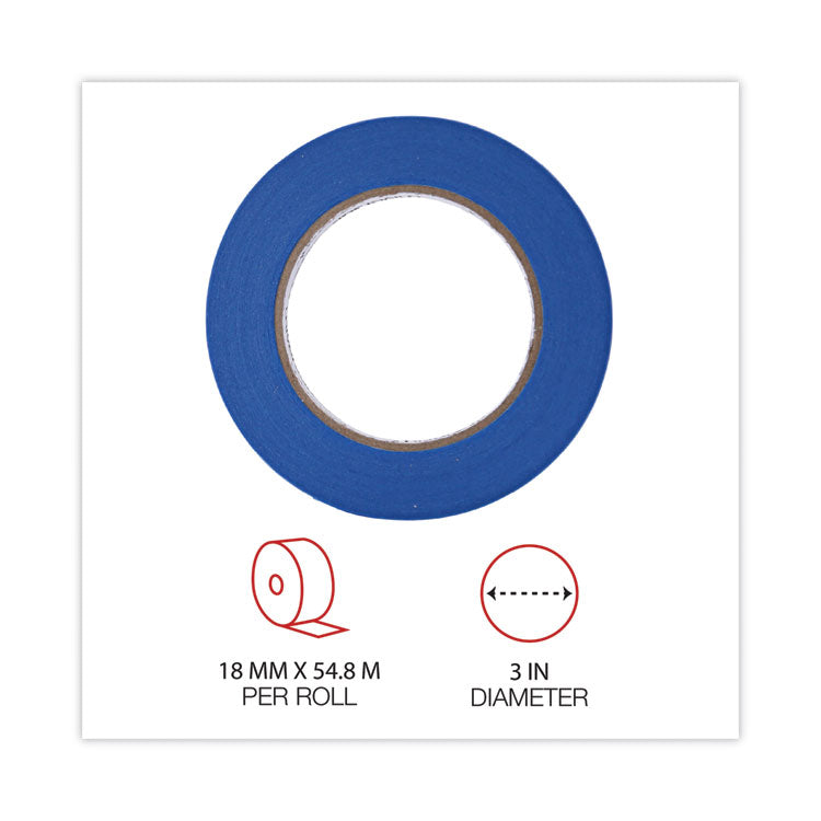 Blue fine crepe paper masking tape is a specially formulated pressure-sensitive, synthetic rubber adhesive designed for exposure to sunlight for up to fourteen days. Exhibits easy, clean removal from most surfaces. Excellent conformability as well as smooth backing for superior paint lines and reduced fingertip abrasion. Consistent, easy unwind, and resistant to humidity and paint bleed-through. Also has secure adhesion and is stain-resistant. Grade: Heavy-Duty; Core Size: 3"; Dispenser Included: No; Adhesive Material: Synthetic Rubber.