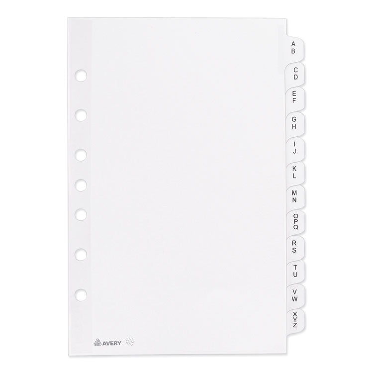 Get organized with these Mini Pre-printed Dividers. The small size is perfect for dividing mini binders or planners. The handy pre-printed tabs give you more versatility, and the clear reinforced binding edge and tabs offer greater durability. Quickly find the section you are looking for with easy-to-read black lettering. For easy reference at a glance, our pre-printed dividers spell it out for you. These dividers are seven hole-punched for 5.5" x 8.5" small format binders and organizers. Index Divider Style: Alpha; Index Divider Size: 8.5 x 5.5; Punched/Unpunched: 7-Hole Punched; For Use With: Mini Ring Binders/Planners.