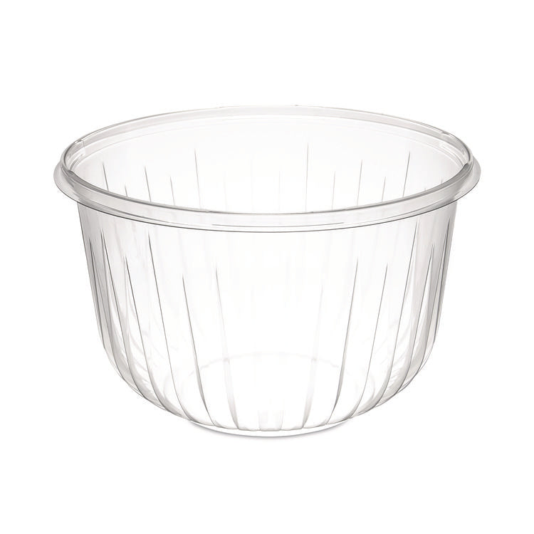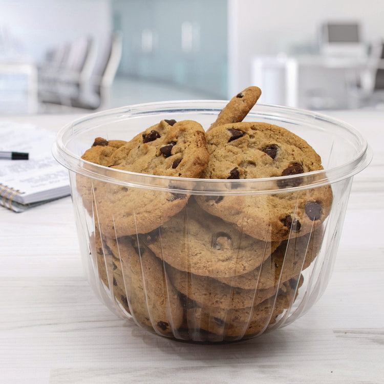 Clear bowls allow you to easily identify the product within. Elegant design on the bowls creates an upscale image. These bowls are also stackable, saving storage space. They're versatile, good for holding many different kinds of items including bakery and deli goods and produce. Food Container Type: Base; Material(s): PET Plastic; Material Type: Plastic; Interior Volume Capacity: 64 oz.