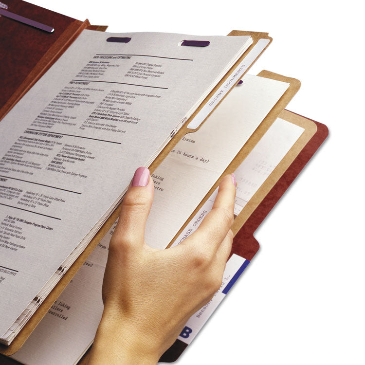 Minimize the time you spend searching for documents and increase the efficiency of your filing system. Smead's Pressboard Classification File Folders with SafeSHIELD Fasteners make it easy to organize your critical information by providing a number of different filing surfaces that can be used to separate your documents in subcategories and keep them in proper sequence. Purposefully designed to provide a solution for the most common fastener issues, our Pressboard Classification File Folders feature SafeSHIELD Coated Fasteners that help you avoid hand injuries, ripped papers and excessive fastener crinkling. The 2" expanding spine made of tear resistant material offers greater storage capacity for bulky projects. Compatible with our Viewables Multipurpose Labels (sold separately). 2/5 Cut Right of Center Position Self Tabs on Cover. Folder Size: Letter; Total Number of Dividers: 3; Total Number of Fasteners: 8; Max Folder Expansion: 3".