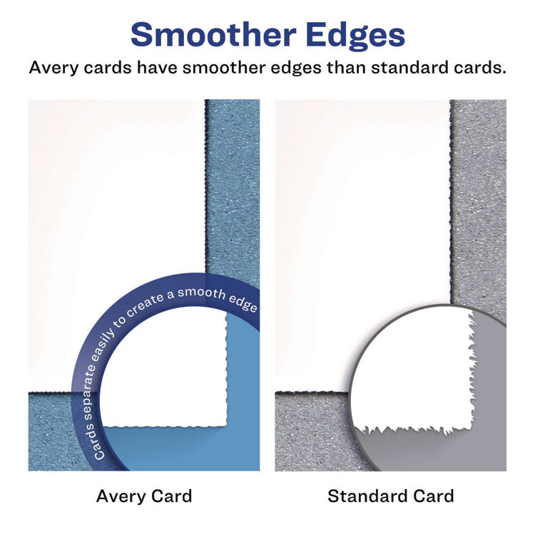 Create professional-looking invitations, announcements, reminders, seasonal offers and more. Sturdy bright white cardstock is either matte-coated for vivid graphics and sharp text or has a premium quality glossy finish ideal for photos. Ultra-fine perforations let you separate cards cleanly and easily. Meets U.S. postal regulations for postcards. Easy to customize with free templates and designs using Avery Design & Print Online. 8.5" x 11" sheets. Inkjet Print-to-the-Edge Capability—Add color to the entire card. Paper Color(s): Matte White; Card Height: 4"; Card Width: 6"; Cards Per Sheet: 2.